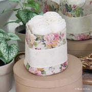 Cestino dal design raffinato e naturale, perfetto per decorare il bagno o come idea regalo elegante e utile. Realizzato in tessuto con stampa floreale su fondo grezzo, presenta un inserto in tela Aida color avorio da personalizzare con ricamo a punto croce. L’interno plastificato garantisce praticità e durata. Il set comprende 4 lavette in morbida spugna di cotone avorio, ideali per l’uso quotidiano o per ospiti.