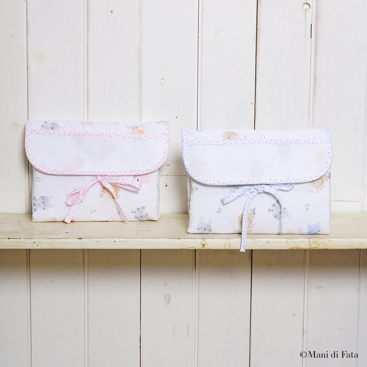 Fasciatoio da viaggio confezionato nella parte interna in pura spugna di cotone. L'esterno è realizzato in piquet di cotone trapuntato con stampa animaletti e con inserto in tela Aida da personalizzare a punto croce. Pensato per essere facilmente trasportabile durante gli spostamenti fuori casa, può essere chiusa a busta grazie a pratici laccetti. Disponibile in due varianti colore. Il prodotto è realizzato in Italia.