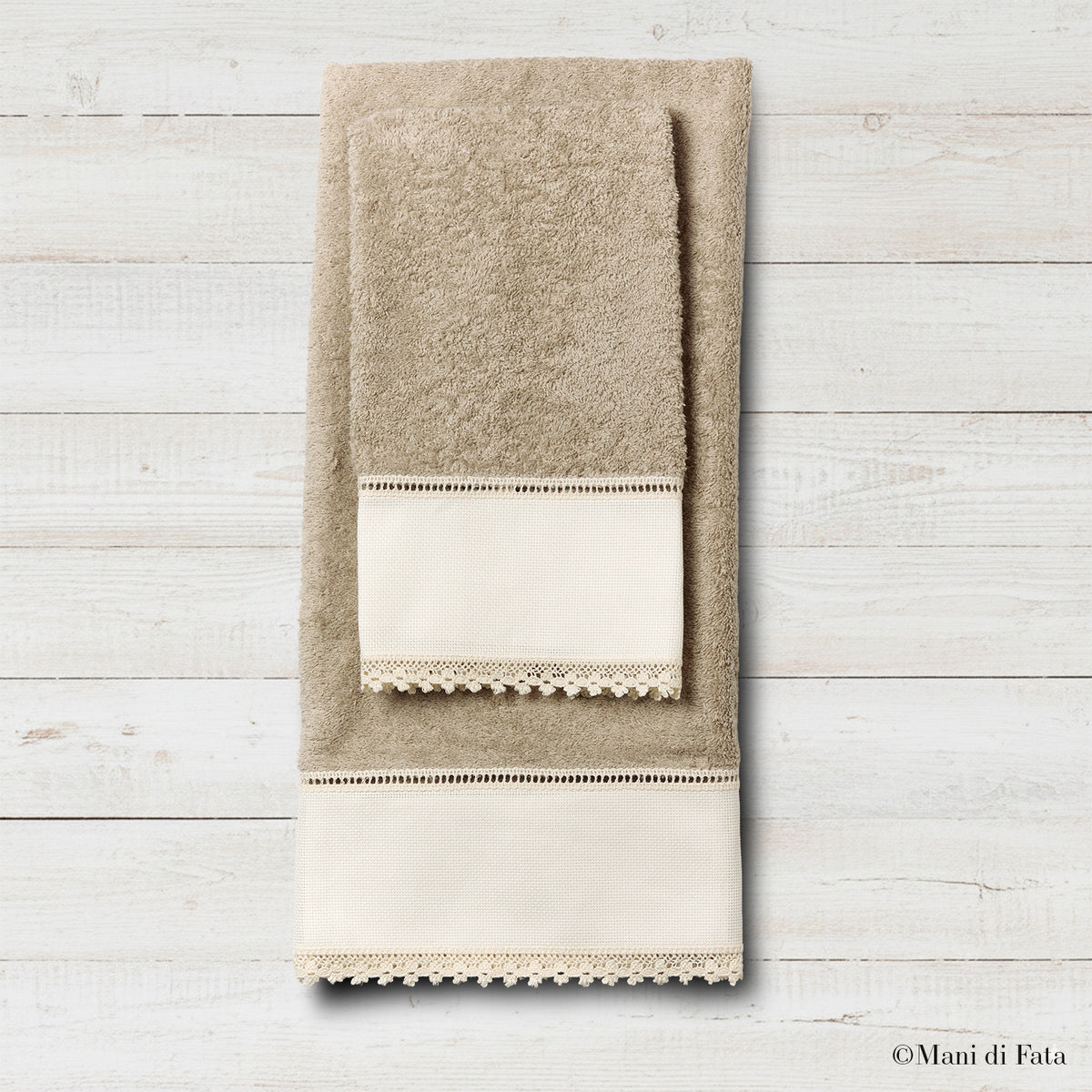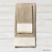 Raffinatacoppia di asciugamani viso e ospite in spugna di cotone color tortora, pensata per chi ama i dettagli eleganti e la qualità artigianale. L’inserto in tela Aidaè impreziosito da unadelicata finizione in pizzo macramè realizzato a macchina, che dona al set un tocco romantico e senza tempo.