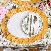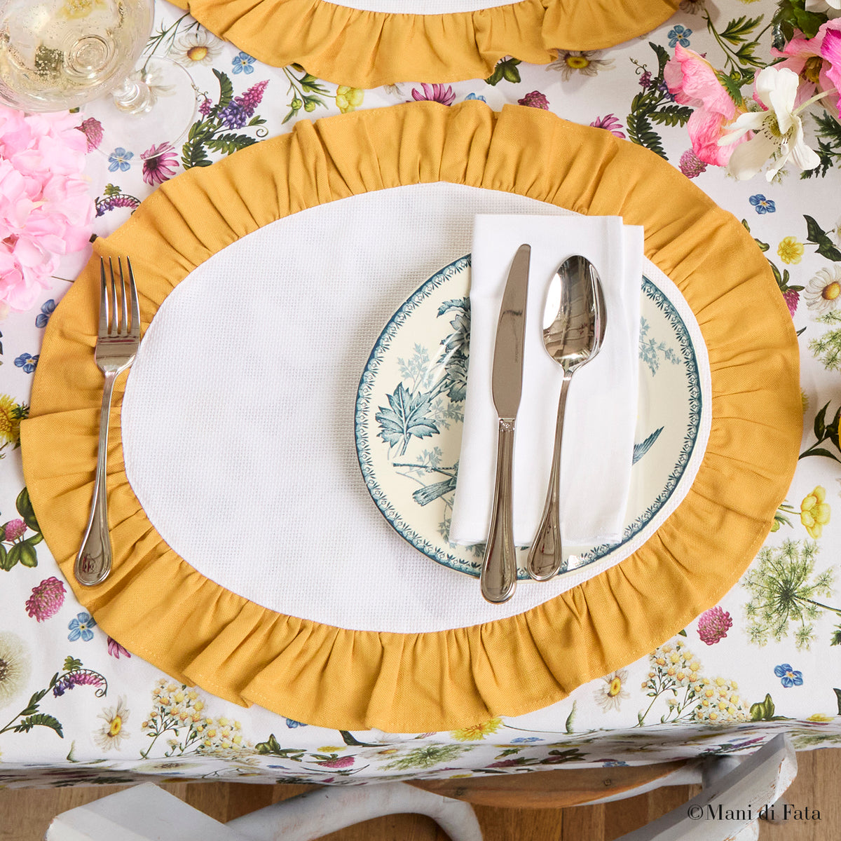 Sottopiatto ovale con inserto in tela Aida bianco, rifinito con alte rouches nella tonalità del giallo, perfetto per portare a tavola una fresca ventata di primavera. La lavorazione curata e il design elegante lo rendono ideale per valorizzare ogni mise en place.