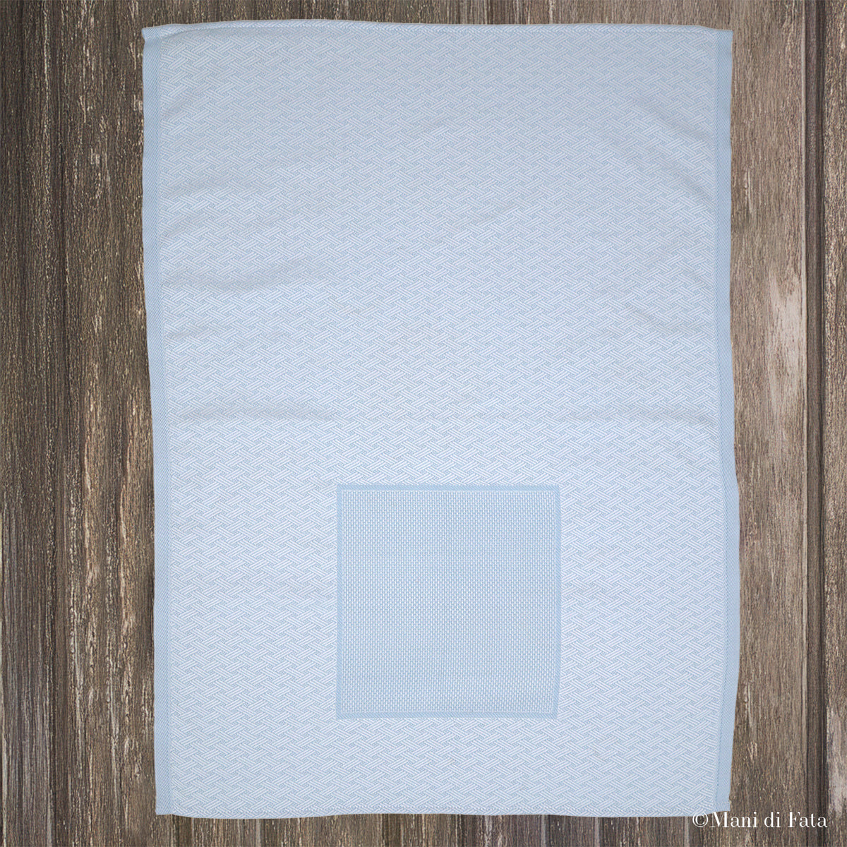 Strofinaccio in jacquard di puro cotone celeste, decorato con motivo di farfalle e fiori. Completo di inserto in tela Aida bianca (55 fori) da ricamare a punto croce, unisce praticità e creatività. Rifinito con orlo semplice e dotato di piccanello per appenderlo. Prodotto artigianale 100% Made in Italy.