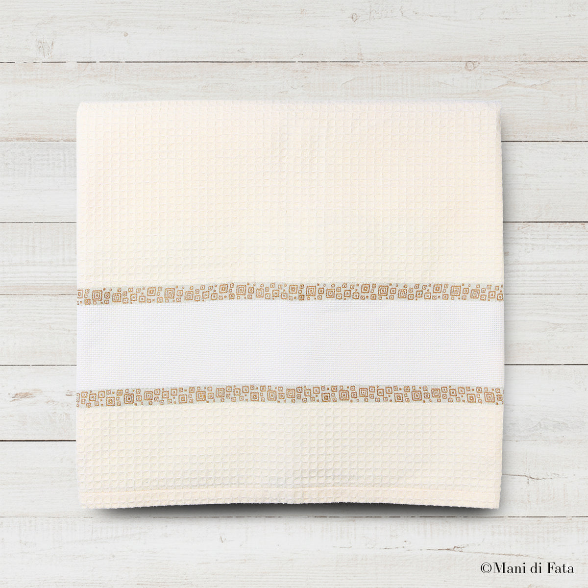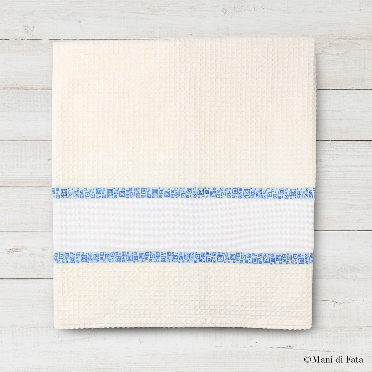 L’inserto in tela Aida intessuta è ideale per il ricamo a punto croce, permettendo di personalizzare il telo con iniziali o motivi decorativi.