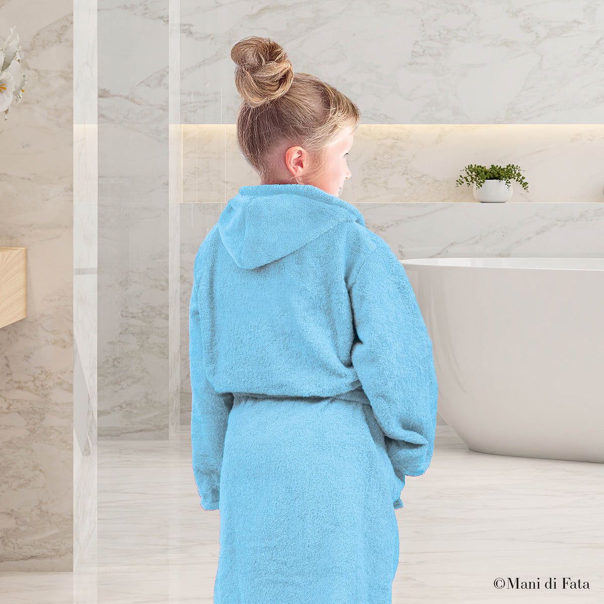 Accappatoio junior confezionato in morbida spugna di cotone colore turchese, ideale per avvolgere e proteggere i bambini dopo il bagno o la piscina. Dotato di cappuccio, garantisce comfort e calore. Disponibile in varie misure per seguire la crescita dei bambini.