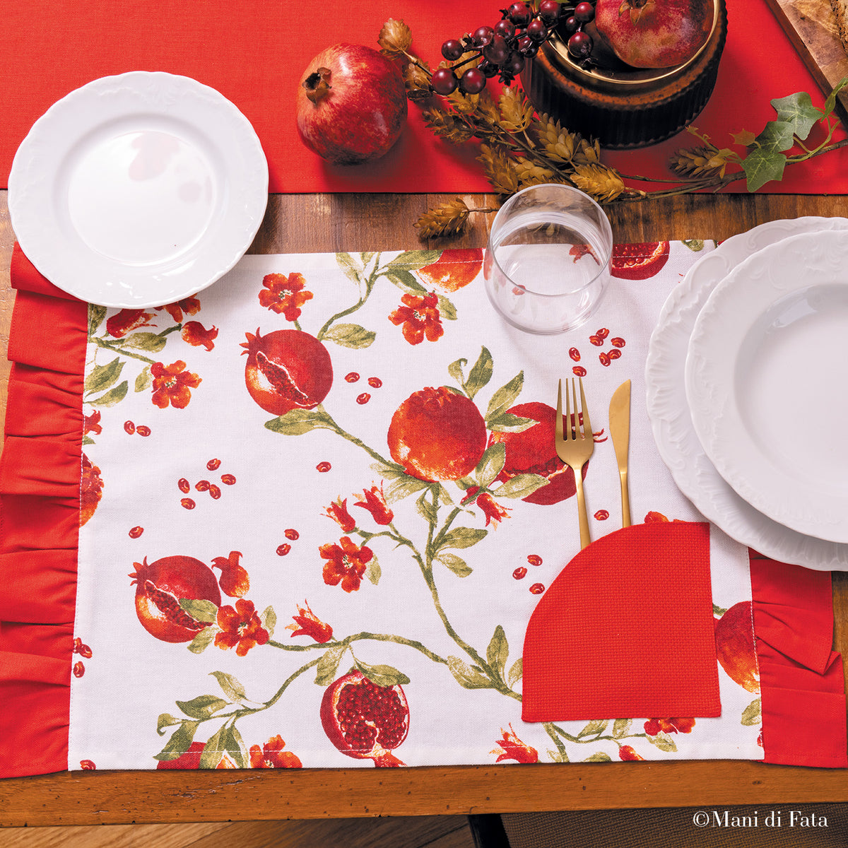 In cotone stampato con fantasia di melograni, simbolo di prosperità e convivialità