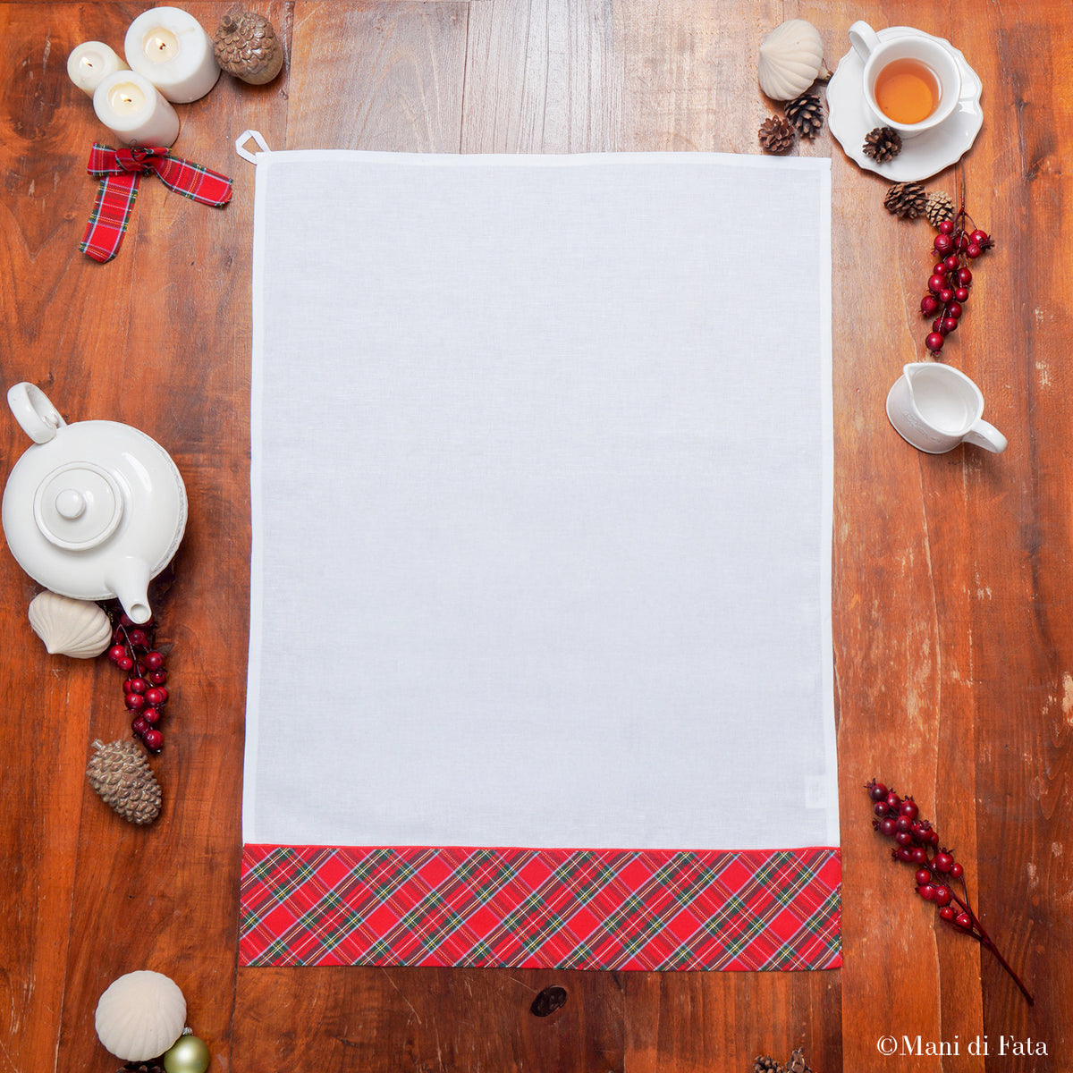 Asciugapiatti confezionato a mano in misto lino bianco ottico, impreziosito da una bordura in tessuto scozzese che dona un tocco elegante e tradizionale. Il capo è ideale da disegnare e da ricamare a punti vari, perfetto per chi ama creare decorazioni artigianali e personalizzate.