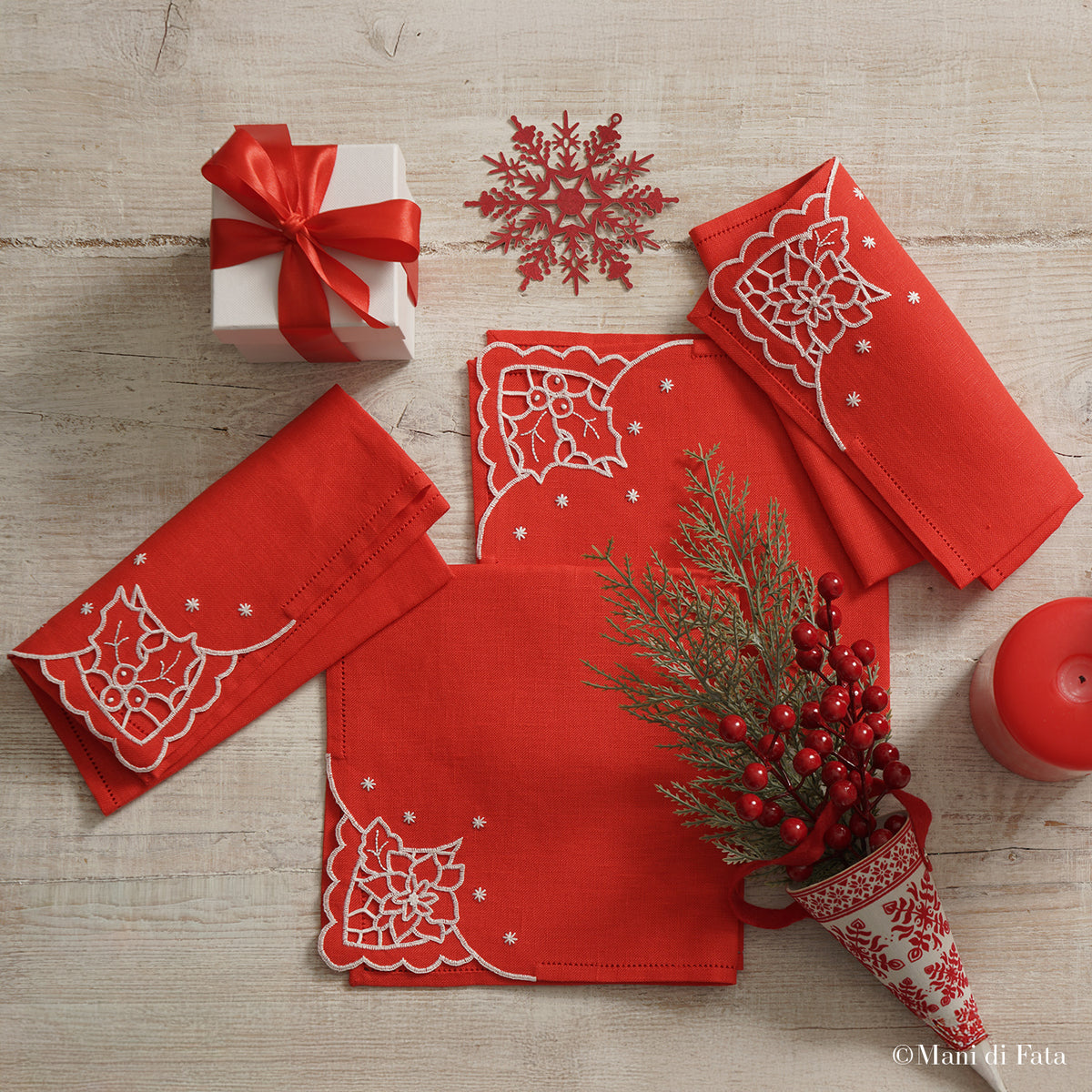 Un set raffinato e festoso per rendere la tavola natalizia ancora più elegante. Gli 8 tovaglioli sono realizzati in lino rosso disegnato e sono pensati per essere rifiniti con un delicato orlo a giorno, che dona un tocco di pregio artigianale.