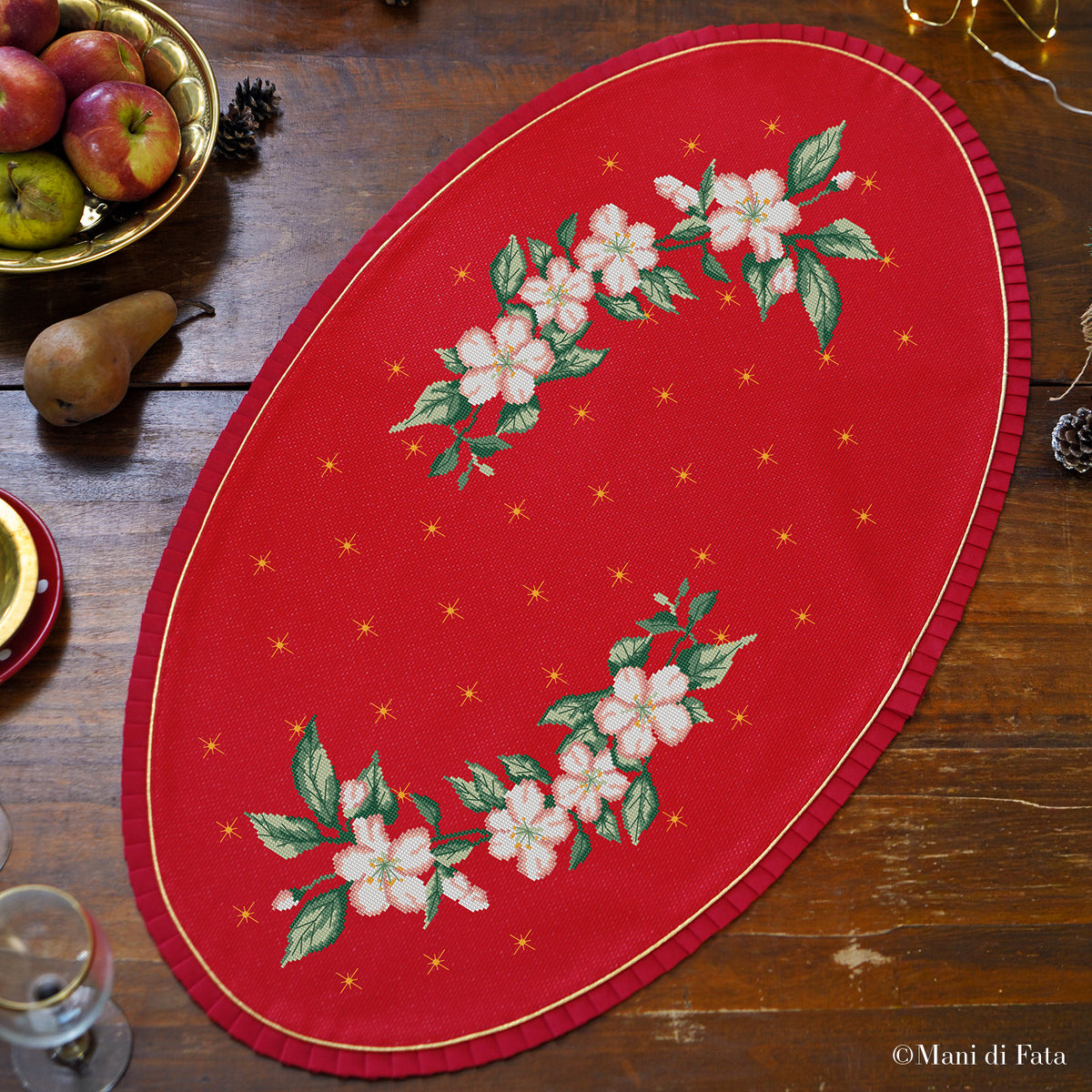 Un raffinato progetto natalizio, confezionato a mano per arricchire la tua tavola con eleganza e creatività. Il centro è realizzato in tela Aida rossa con lurex ed è impreziosito da una delicata bordura a plissé con dettagli dorati che donano luminosità e prestigio.