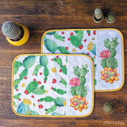 Kit coppia di americani confezionati a mano in cotone stampato con fantasia cactus, inserto in tela aida bianca laterale da ricamare a punto croce, con allegri cactus fioriti, da realizzare con 13 matassine di cotone Mulinè e lo schema a colori.