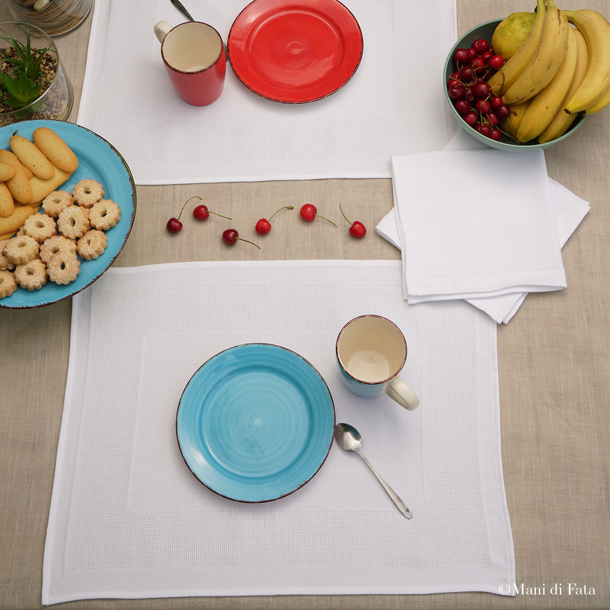 Tovaglietta all’americana con tovagliolo coordinato, realizzati in jacquard di puro cotone bianco. Entrambi sono arricchiti da inserto in tela Aida lungo i bordi, perfetto da personalizzare con ricamo a punto croce. Un set elegante e creativo, realizzato artigianalmente in Italia.
